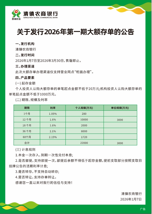 关于发行2026年第一期大额存单的公告