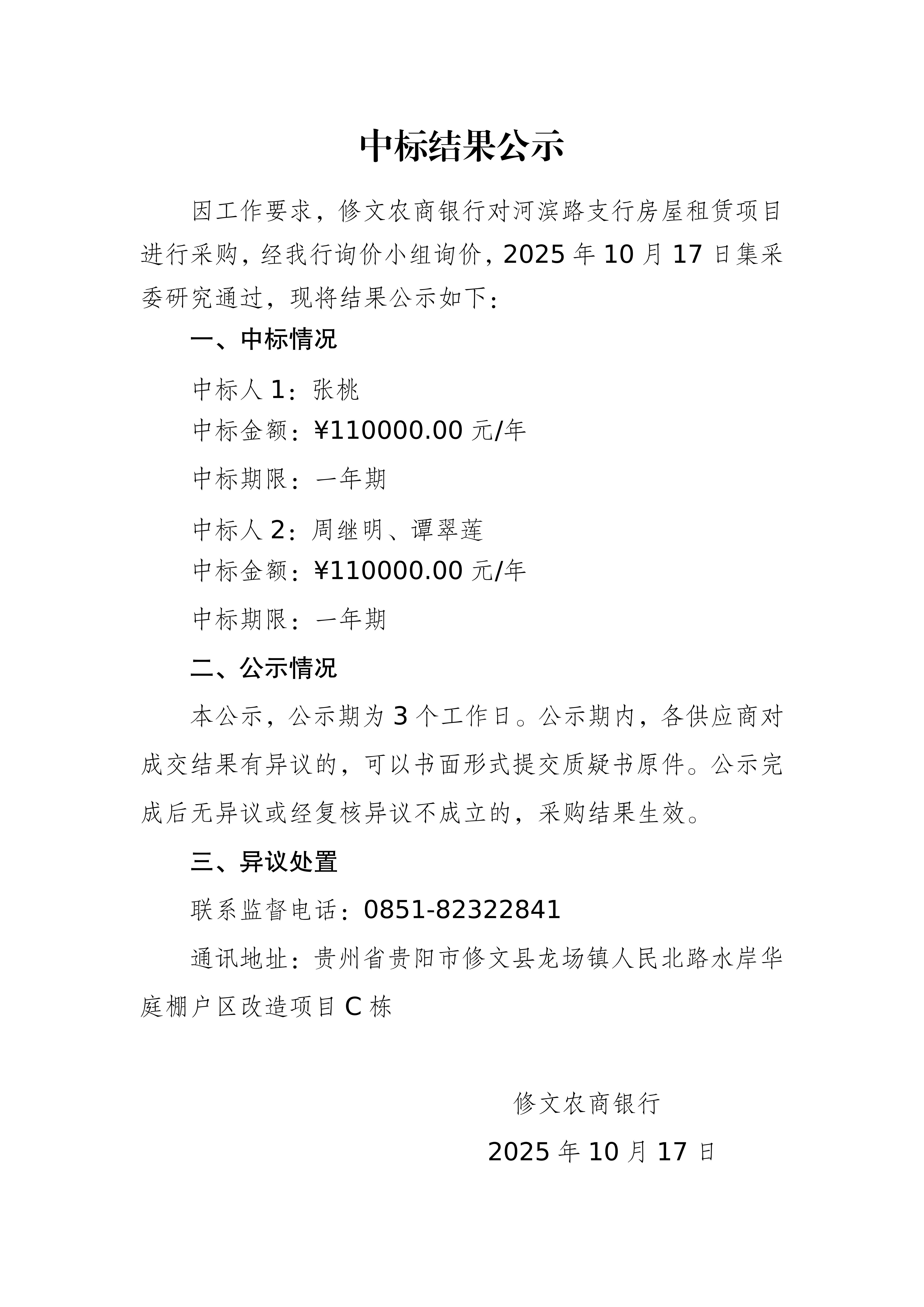 中标结果公示(河滨路支行房屋租赁项目2025038)