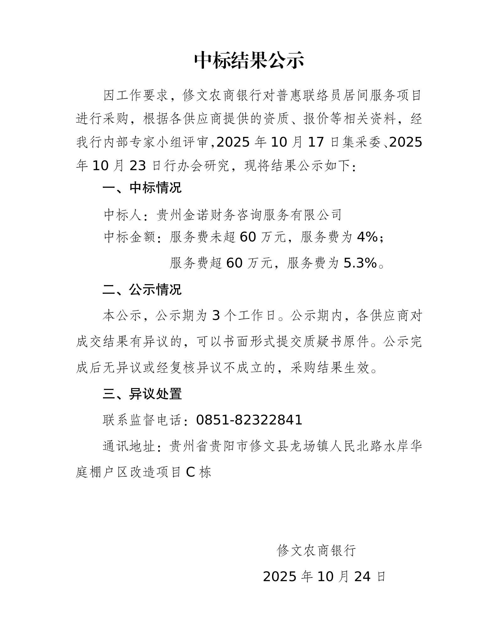 中标结果公示(普惠联络员居间服务项目2025005)