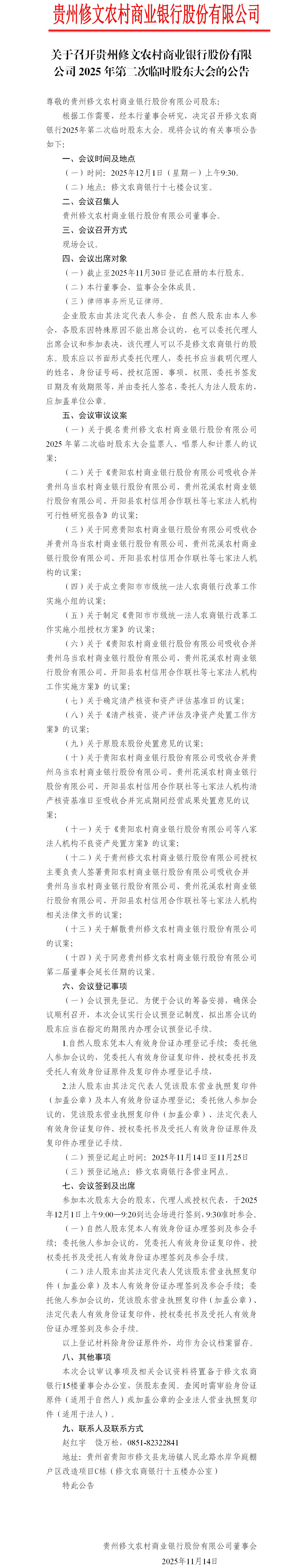 关于召开贵州修文农村商业银行股份有限公司2025年第二次临时股东大会的公告