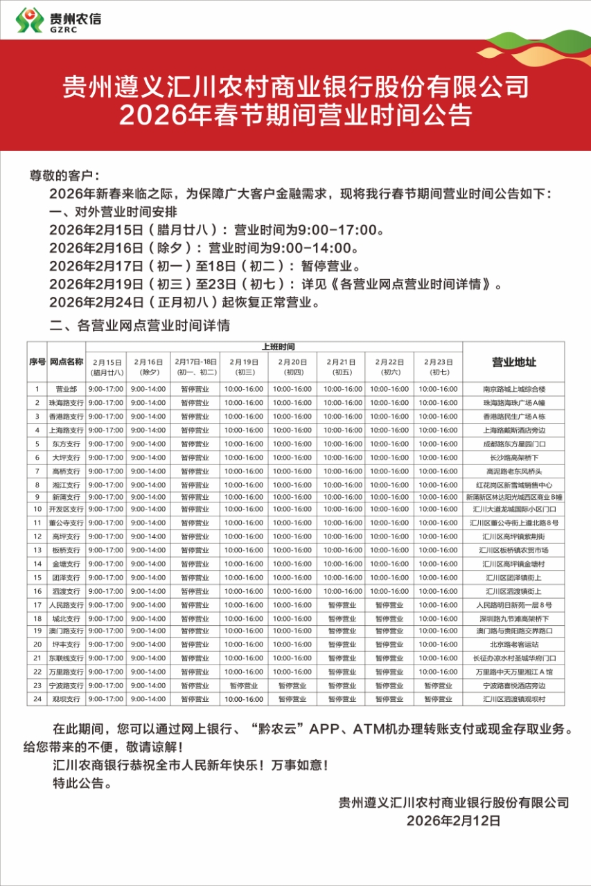 贵州遵义汇川农村商业银行股份有限公司2026年春节期间营业时间公告