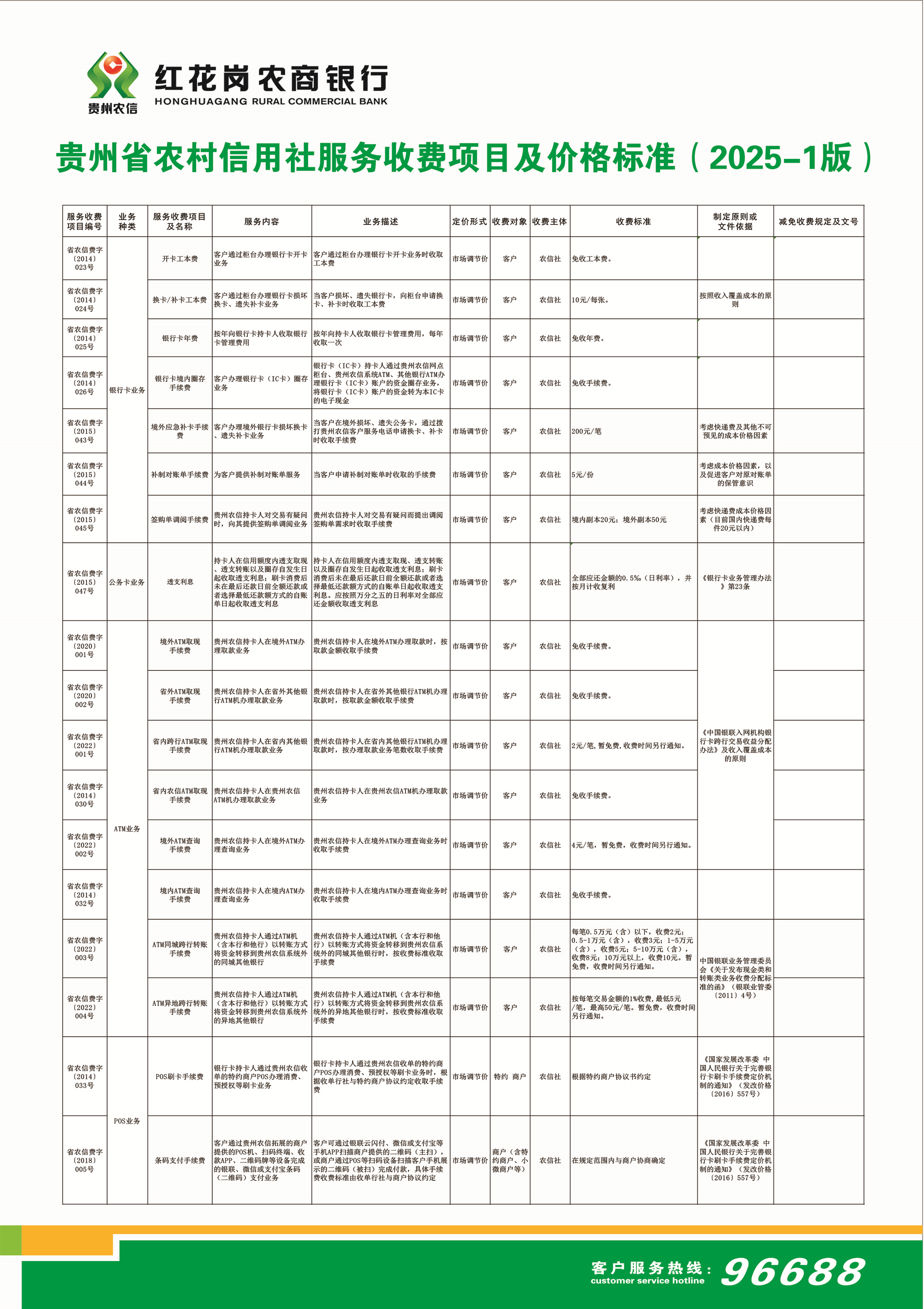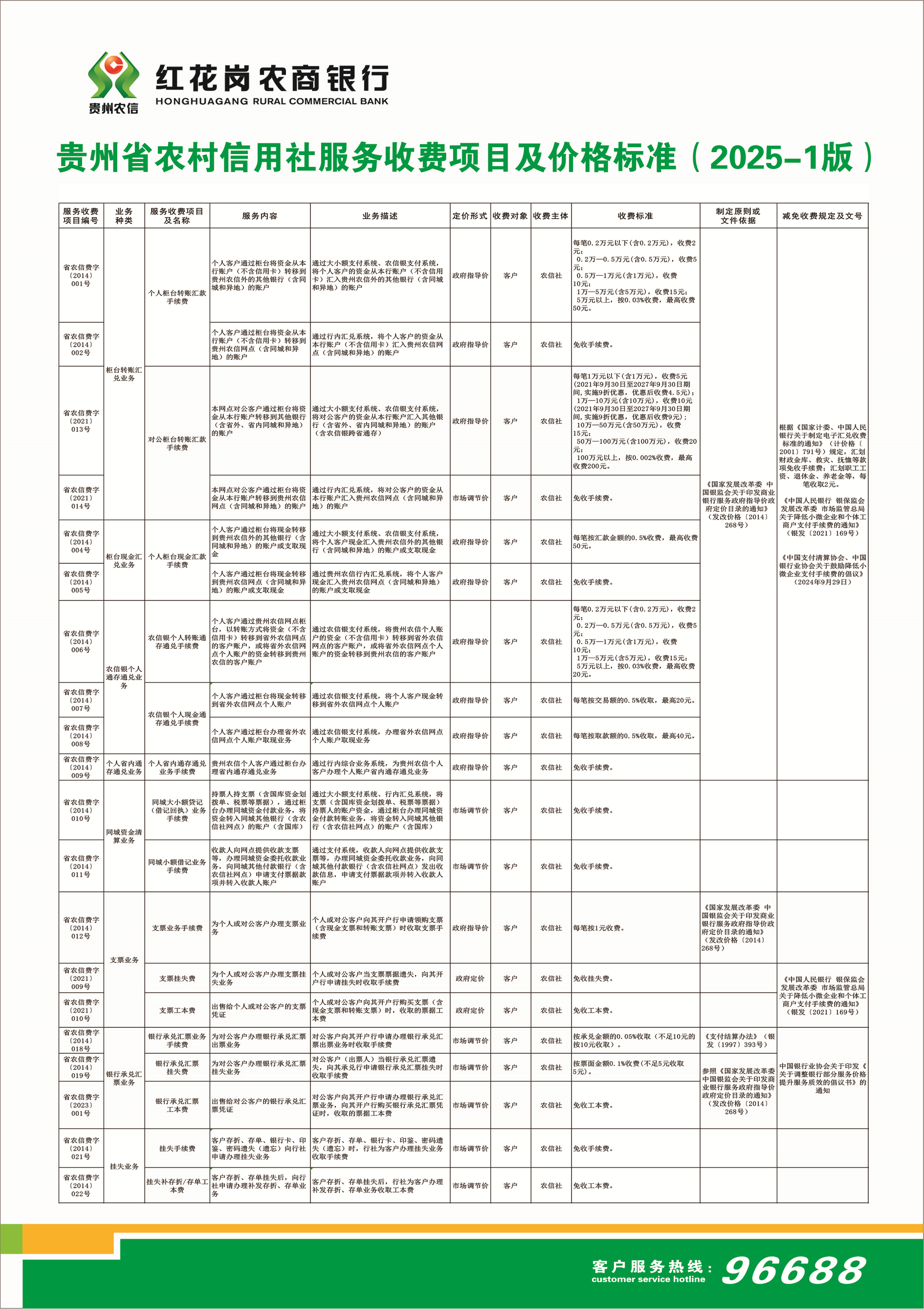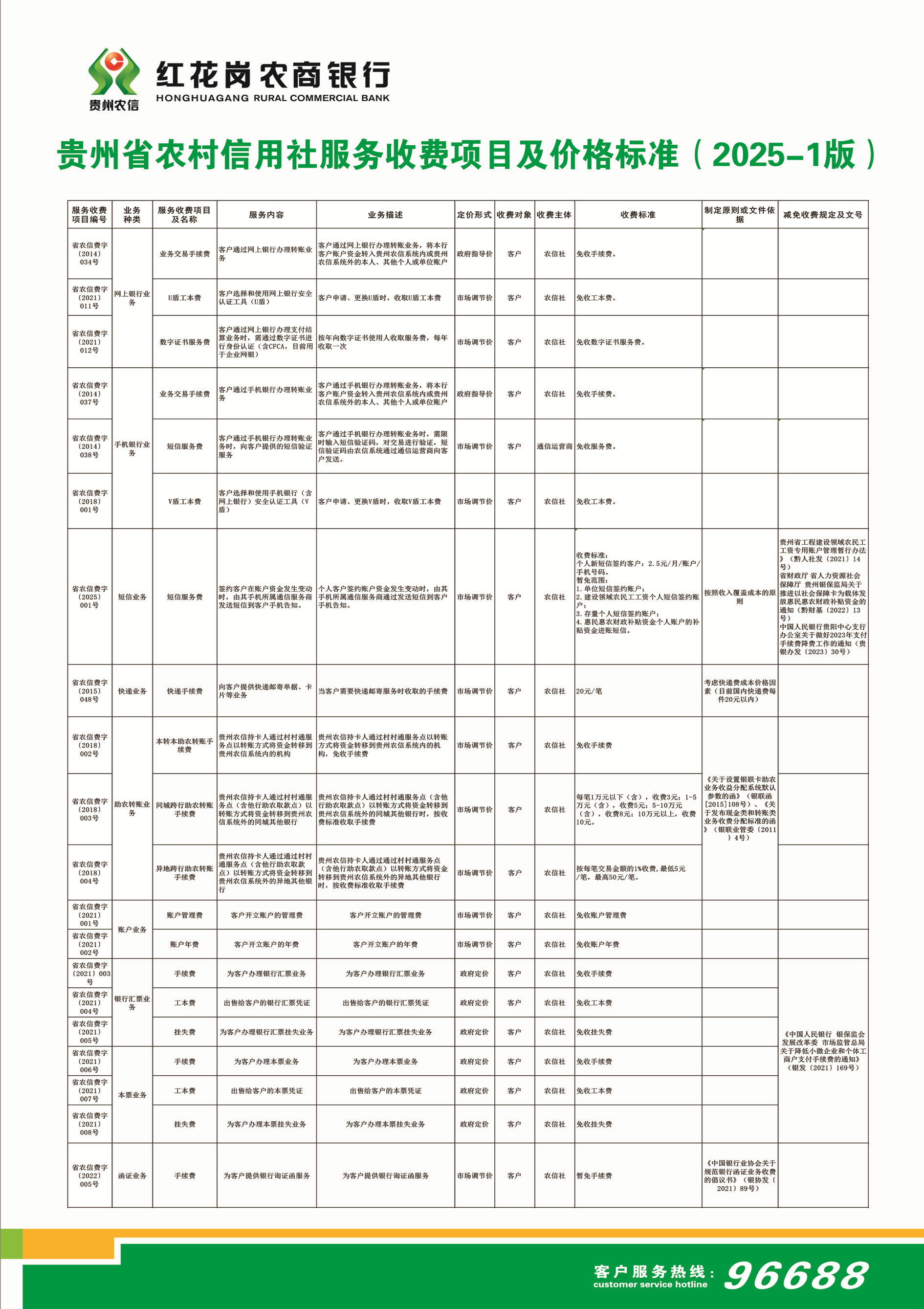 贵州省农村信用社服务收费项目及价格标准(2025-1版)