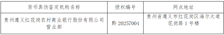 关于中国人民银行贵州省分行授权贵州遵义红花岗农村商业银行股份有限公司营业部为货币真伪鉴定机构的公告