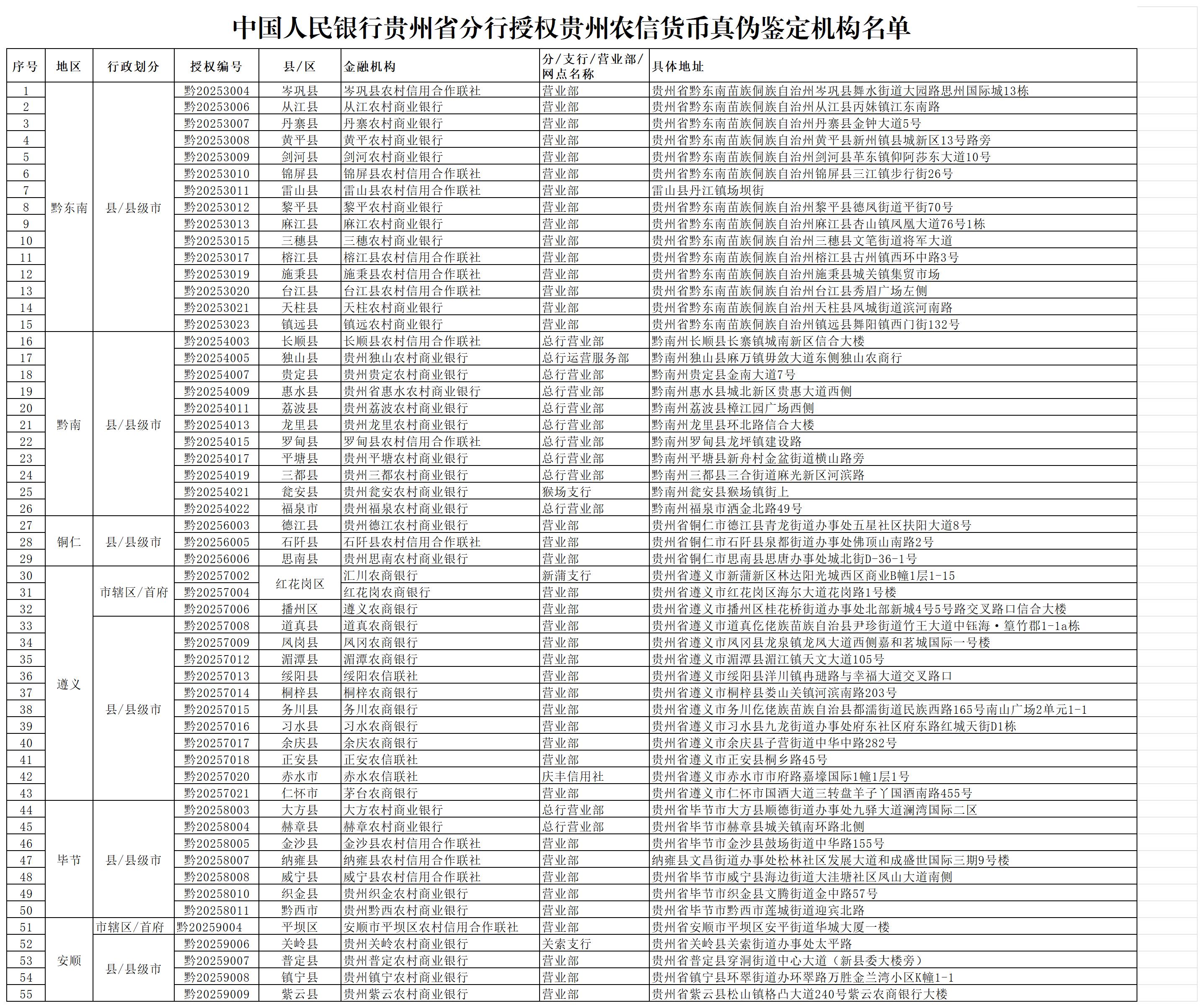 中国人民银行贵州省分行授权贵州农信货币真伪鉴定机构名单通告