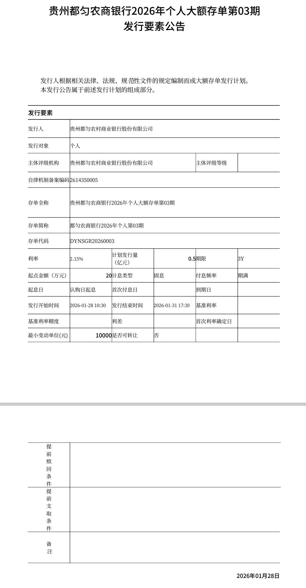 贵州都匀农商银行2026年个人大额存单第03期 发行要素公告