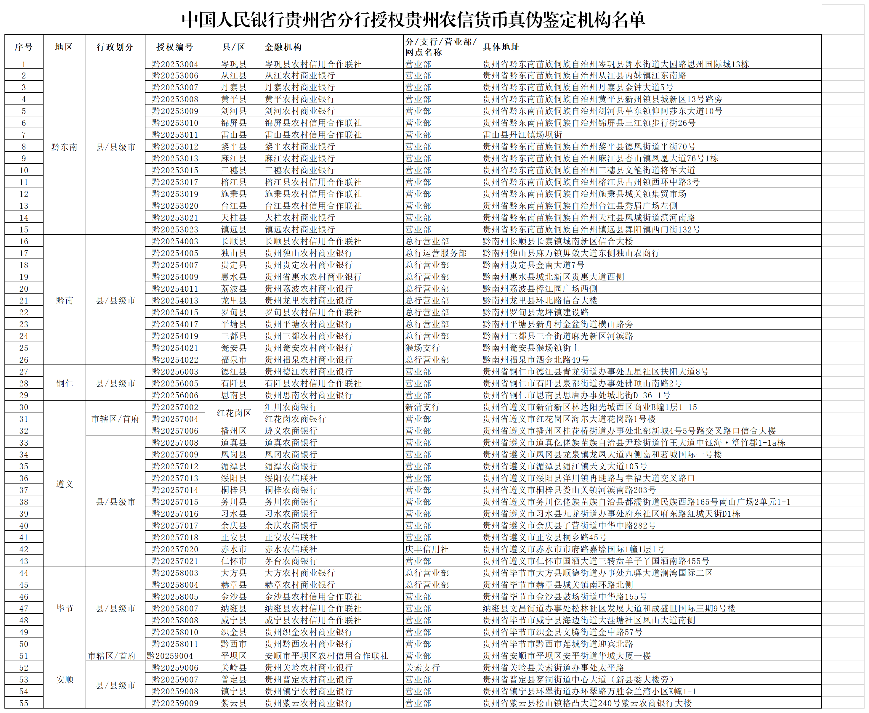 附件:中国人民银行贵州省分行授权贵州农信货币真伪鉴定机构名单