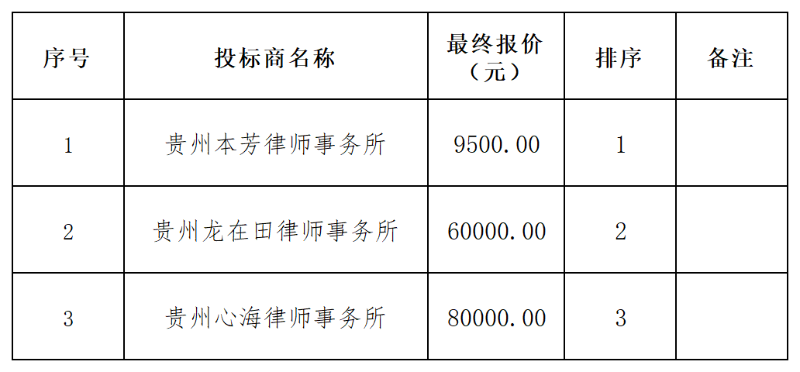 贵州黔西农村商业银行股份有限公司律师事务所法律服务采购项目,共向三家供应商进行询价,本着公开、公正、公平、诚实信用原则,现就本次采购评审结果公示如下: