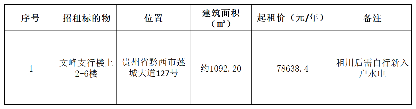 贵州黔西农村商业银行股份有限公司拟对文峰支行2-6楼面向社会进行公开招租,现将有关事项公告如下: