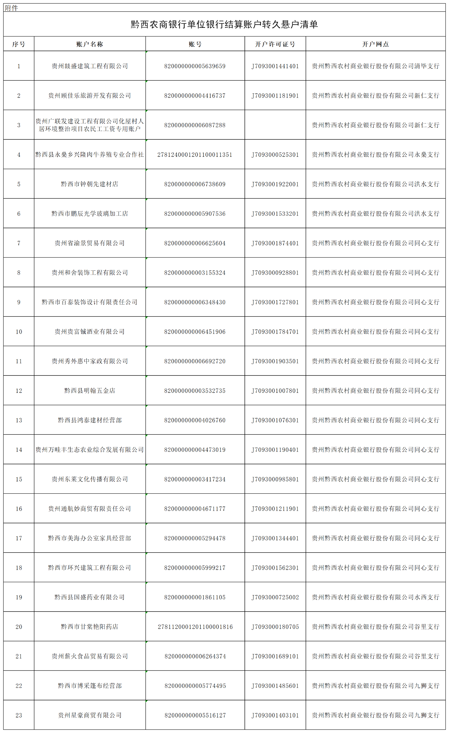 附件:1.黔西农商银行单位银行结算账户转久悬户清单