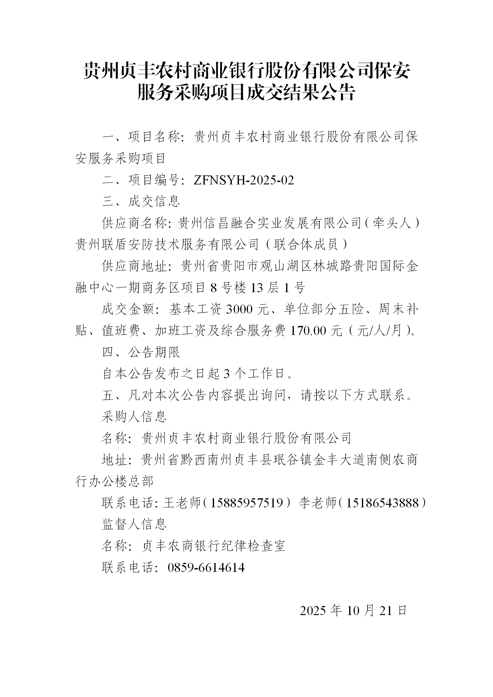 贵州贞丰农村商业银行股份有限公司保安服务采购项目成交结果公告