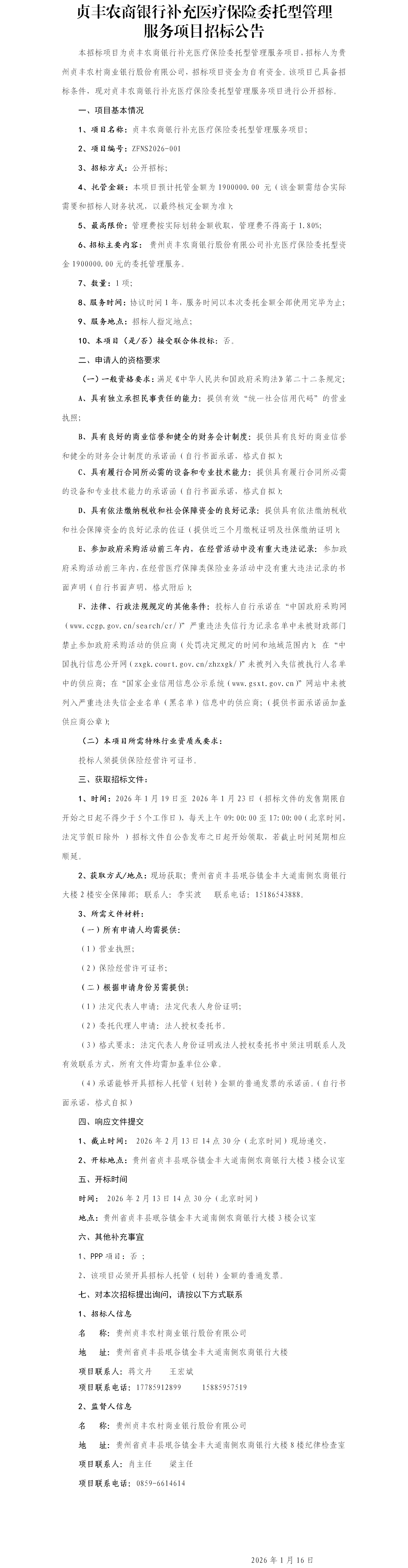 贞丰农商银行补充医疗保险委托型管理服务项目招标公告