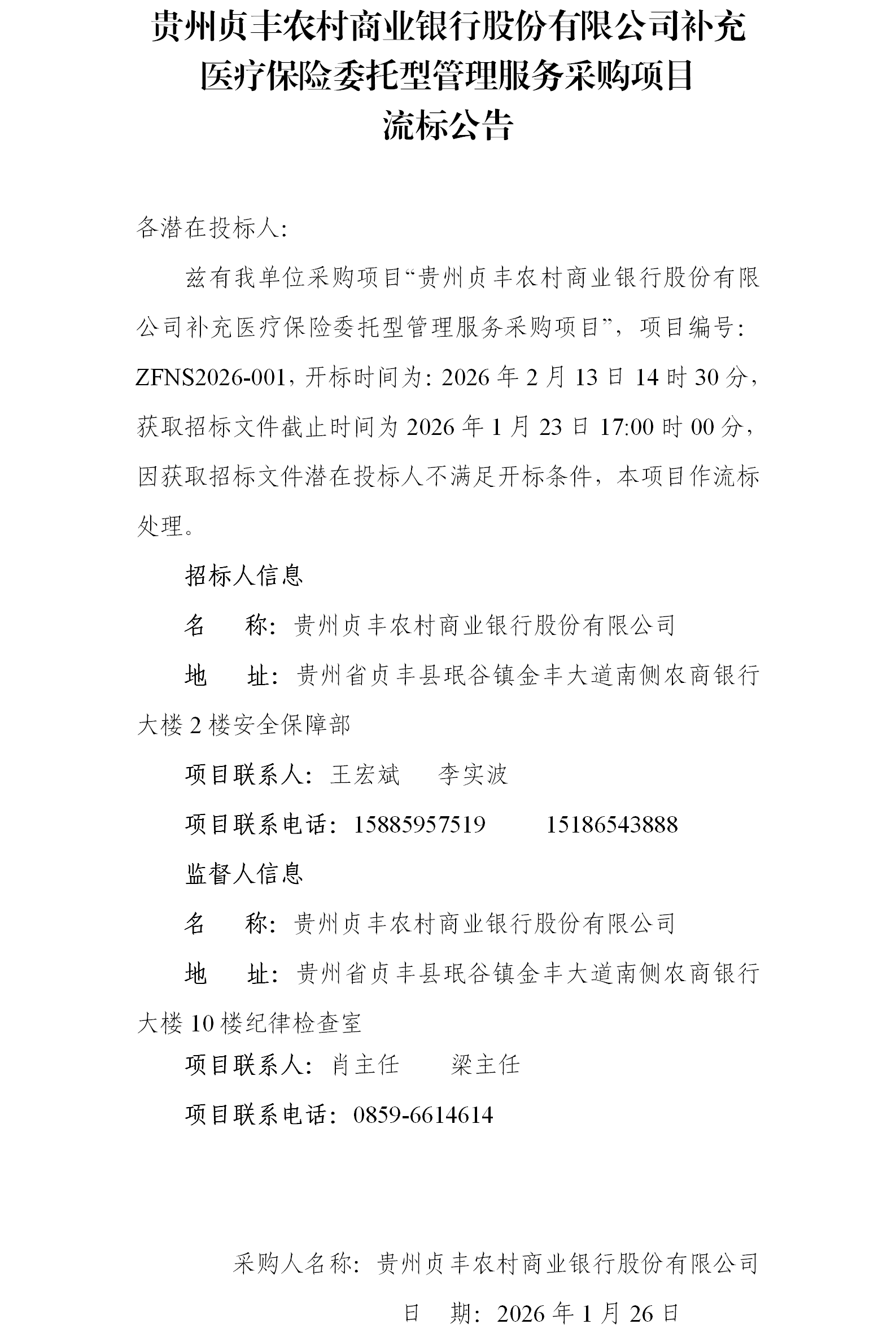 贵州贞丰农村商业银行股份有限公司补充医疗保险委托型管理服务采购项目流标公告
