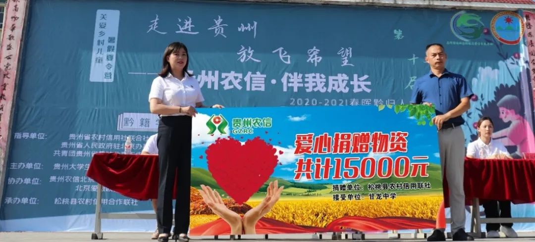 “贵州农信·伴我成长”——关爱农村留守儿童系列主题夏令营活动在松桃县甘龙中学拉开帷幕,甘龙镇党委副书记杨博、甘龙中学校长张健、松桃县农村信用联社副主任冉清心、北京爱薇欧公益基金会理事长张灵怡等参加了开幕仪式。