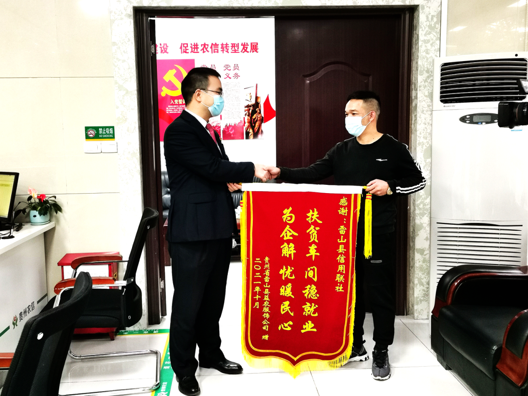 近日,客户王应锋为雷山联社送来一面印有“扶贫车间稳就业,为企解忧暖民心”字样的锦旗。