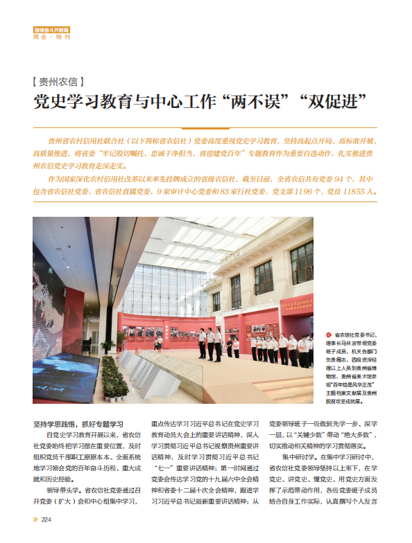 融入社情社史,感悟思想伟力。省农信社党委在党史学习教育过程中,坚持将学习党史与学习社情社史相结合,坚持将理论武装与担当作为相结合,坚持将汲取经验与应对风险相结合,坚持将锤炼党性与为民服务相结合,坚持将精神传承与推动发展相结合。在开展“寻根铸魂砥砺前行”主题活动中融入社情社史,参观安顺信合陈列馆,回眸党领导下的农信发展史,重温峥嵘岁月,在传承中寻根铸魂,在发扬中砥砺奋进;在贵州农信官方微信开辟“学党史、话农信”专栏,教育引导广大党员从党领导下的农信发展历史中汲取砥砺前行的力量。