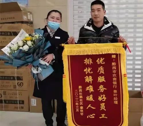 近日,黔西市民廖某琴的儿子将“优质服务好员工排忧解难暖人心”锦旗送到黔西农商银行清毕支行。这是廖大姐及家人对黔西农商银行清毕支行工作的高度认可,表达了她们一家对清毕支行的感激之情。原来廖大姐一家以种植兰花和经营餐馆为生,受疫情和经济下行双重影响,生意经营出现暂时困难。近期,廖大姐看中大关镇丘林村乡村旅游发展势头,并看好一处房屋准备开设一家大型鲢鱼餐馆,已经签订合同准备装修,但因合伙人资金未及时到位,导致不能如期完成店面装修,将要承担几万元违约金,廖大姐一筹莫展,急得像热锅上的蚂蚁。正好这时黔西农商银行清毕支行开展普惠大走访,为她建档评级并发放贷款,解决了她的燃眉之急。
