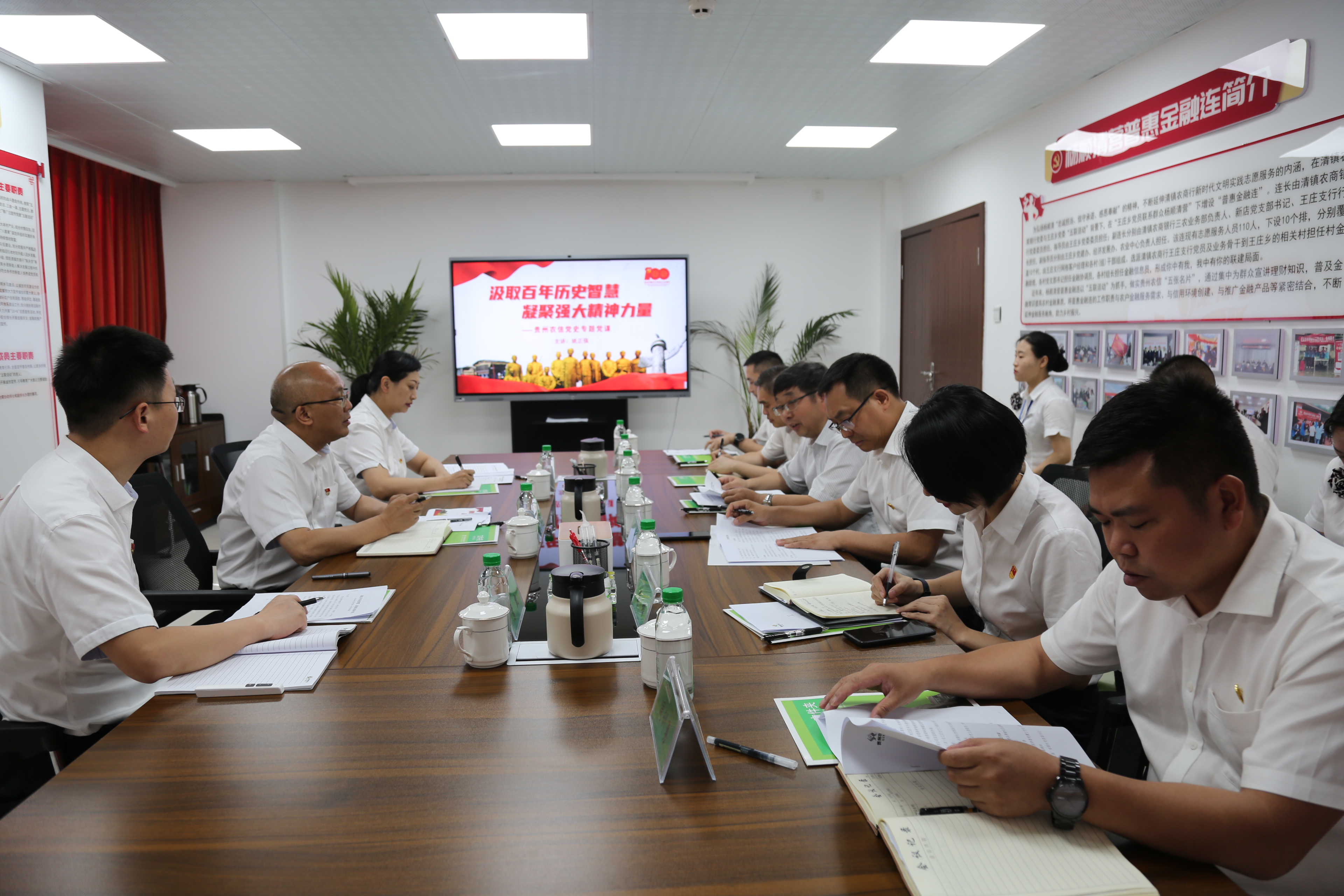 在王庄党支部,姚正强听取了清镇农商银行王庄支部“五联活动”有关工作情况介绍,并为清镇农商银行部分党员干部讲专题党课。讲授中,姚正强同志结合近期学习习近平总书记在庆祝中国共产党成立100周年的重要讲话精神的所学所思所悟,要求清镇农商银行党员干部要以崇仰之情认识党的历史,以敬畏之志对待历史、学习历史,从“红色旅程”中汲取新的智慧和力量,以昂扬姿态奋力开启高质量发展新征程。