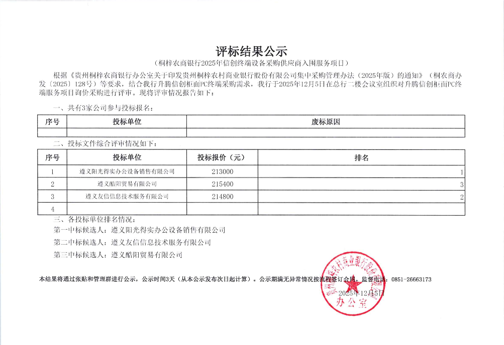 桐梓农商银行2025年信创终端设备采购供应商入围服务项目评标结果公示