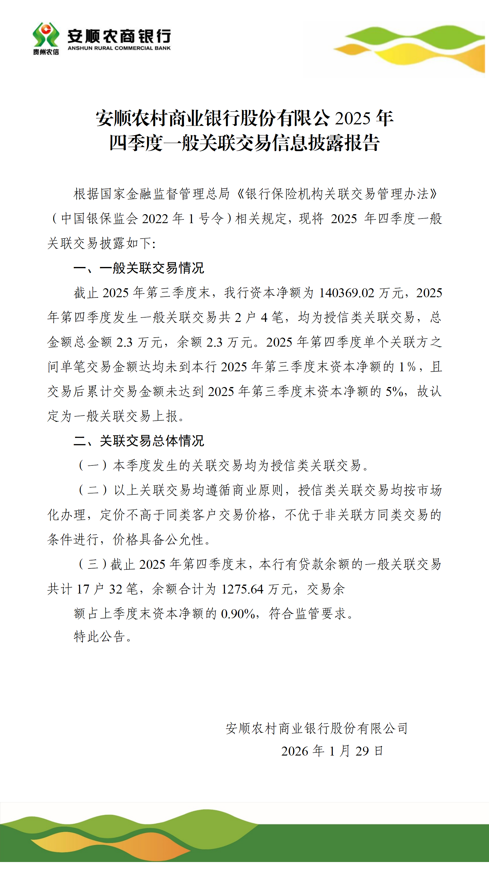 安顺农村商业银行股份有限公司2025年第四季度一般关联交易信息披露公告