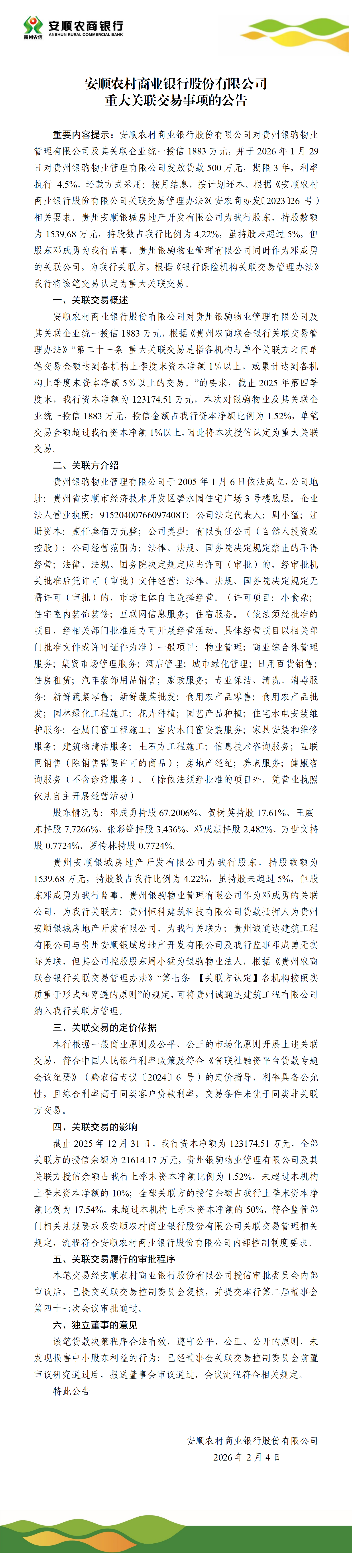 安顺农村商业银行股份有限公司重大关联交易事项的公告