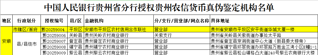 中国人民银行贵州省分行授权贵州农信货币真伪鉴定机构名单
