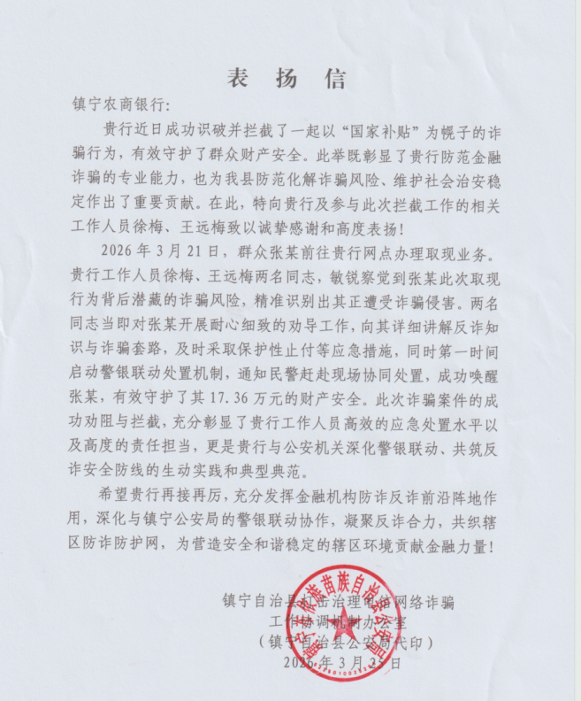 此次成功拦截诈骗,是镇宁农商银行深耕反诈工作、践行金融为民的生动实践,其主动作为、快速响应、有效处置的工作作风获得镇宁县打击治理电信网络诈骗工作协调机制办公室的高度认可,特发表扬信肯定其为辖区防范诈骗风险、维护社会治安稳定作出的重要贡献。