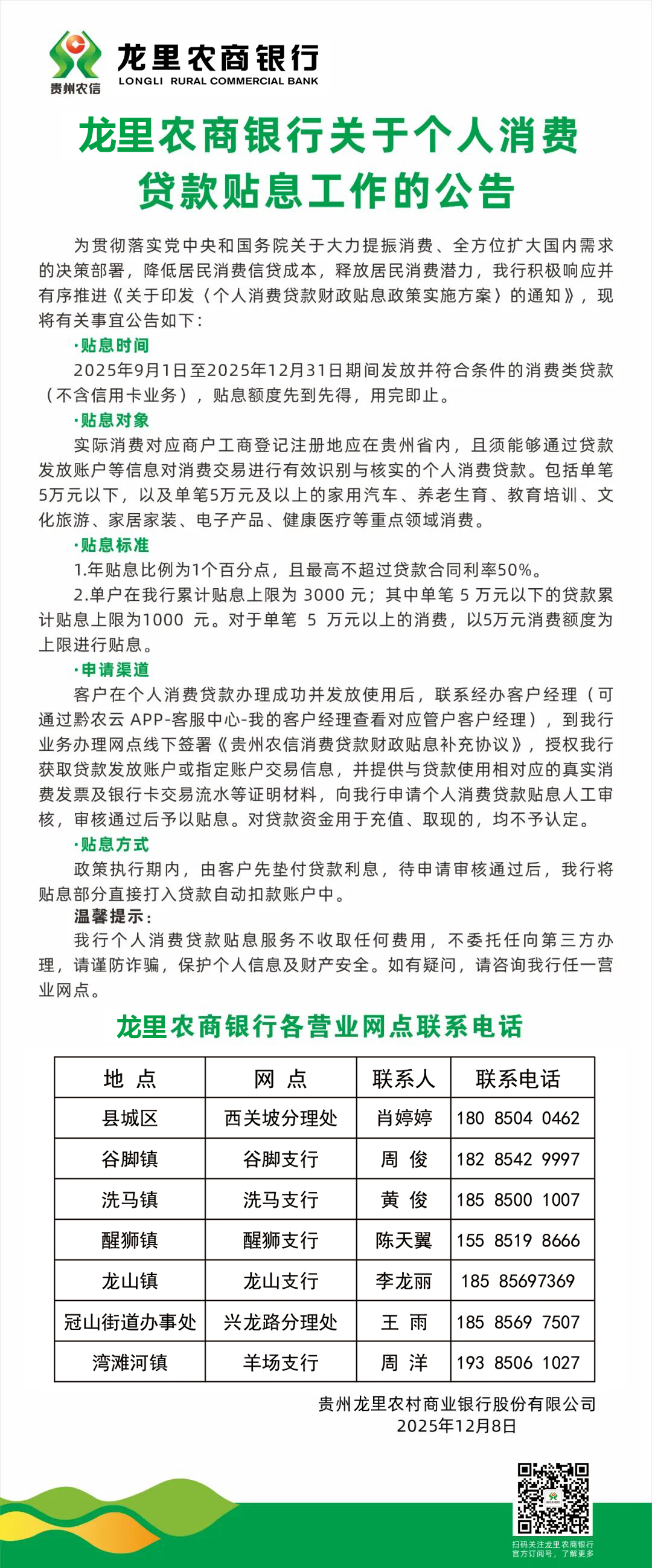 龙里农商银行关于个人消费贷款贴息工作的公告