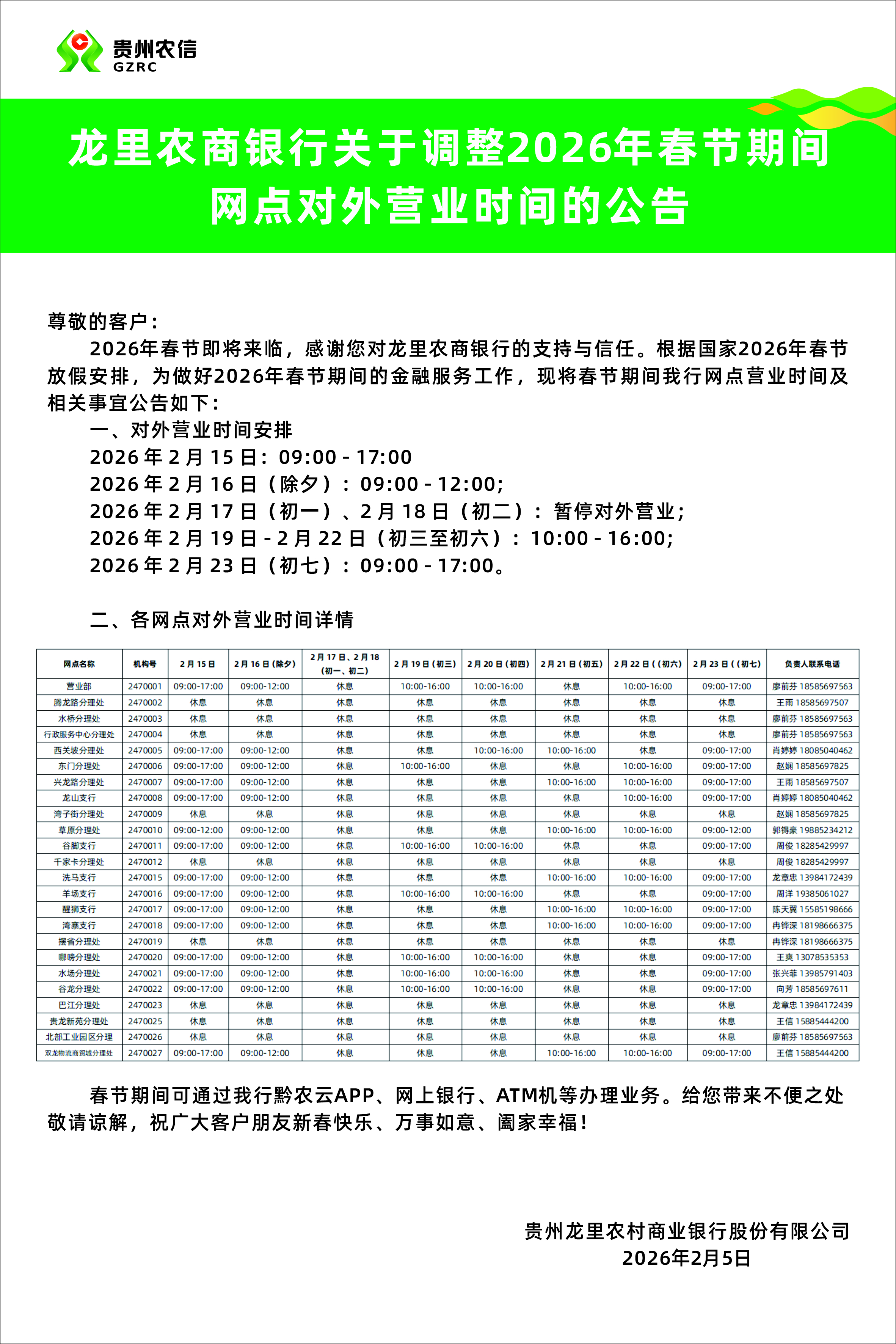 龙里农商银行关于调整2026年春节期间网点对外营业时间的公告