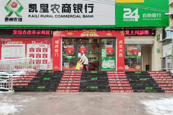 2022年1月31日一大早,除夕瑞雪突如其来,凯里农商银行城西支行为保障客户安全出入,由支行负责人亲自带队不断清扫门前台阶和人行道上的积雪,为上门客户和路过群众开辟一条防滑便道。
