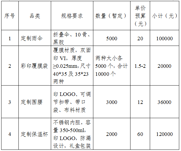 根据锦屏农信联社2026年一季度业务营销方案宣传需要,提升品牌形象与客户服务体验,拟采购一批定制化宣传品。涵盖印有银行标识的雨伞、彩印覆塑膜袋、围腰、保温杯等物品。所有物品需提供样品确认,并需在方案中明确各类物品单价、材质要求及配送安排。