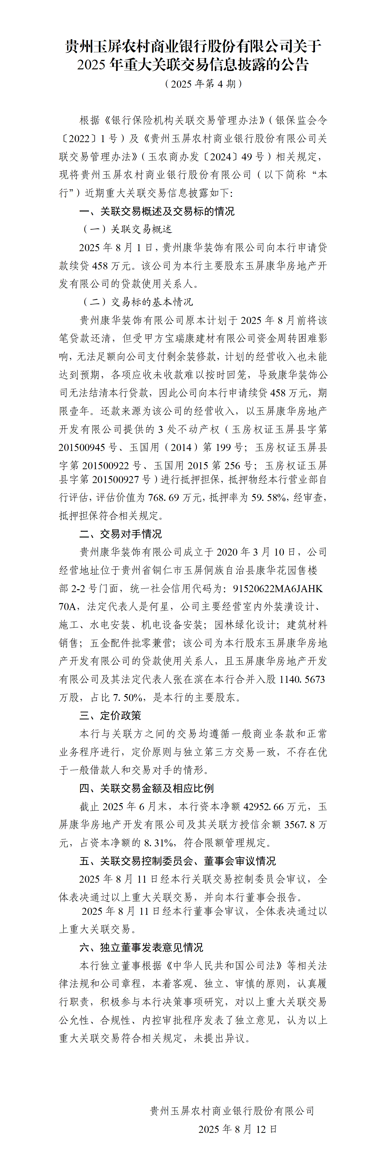 贵州玉屏农村商业银行股份有限公司关于2025年重大关联交易信息披露的公告(2025年第4期)