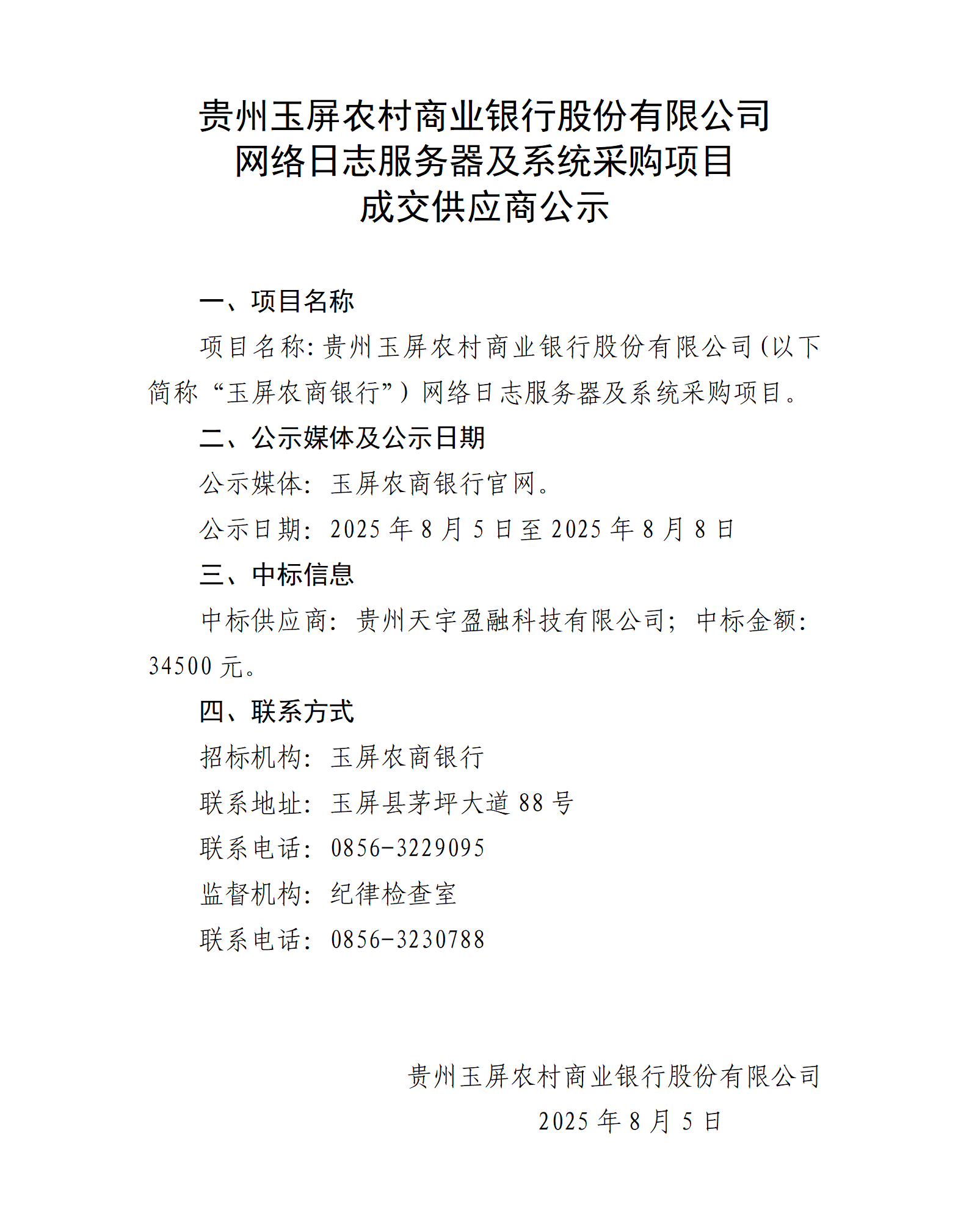 贵州玉屏农村商业银行股份有限公司网络日志服务器及系统采购项目成交供应商公示