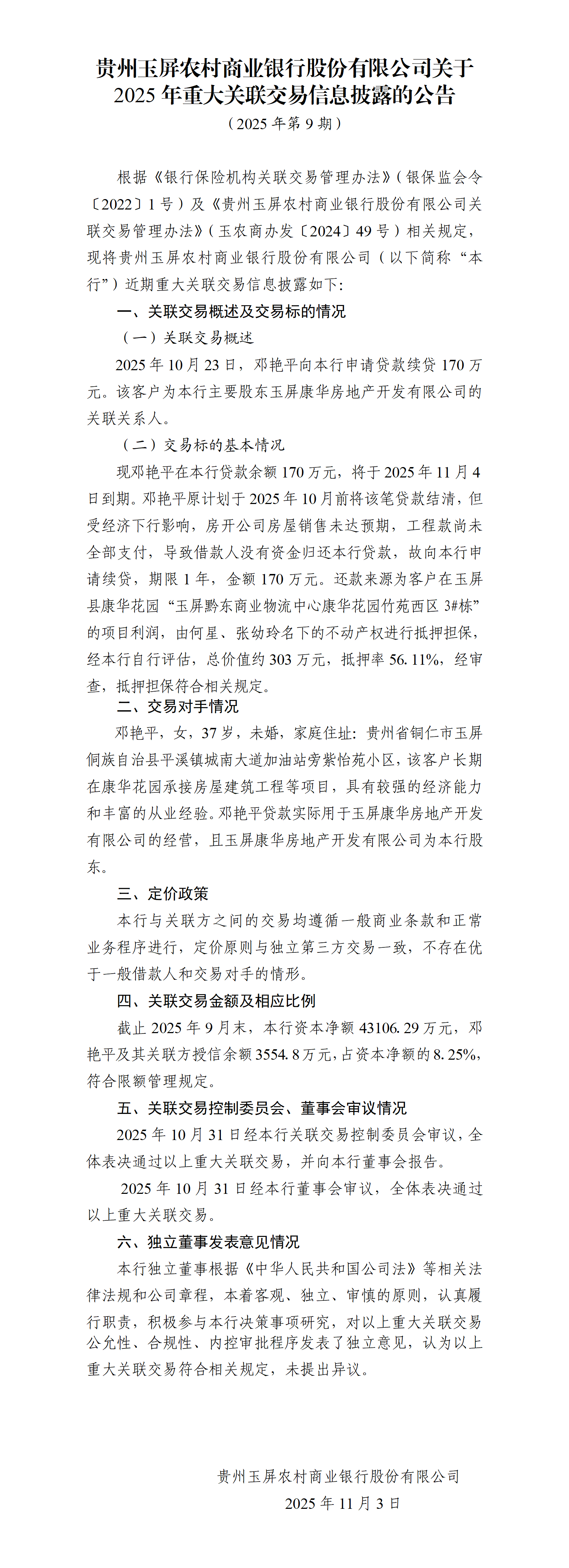 贵州玉屏农村商业银行股份有限公司关于2025年重大关联交易信息披露的公告(2025年第9期)