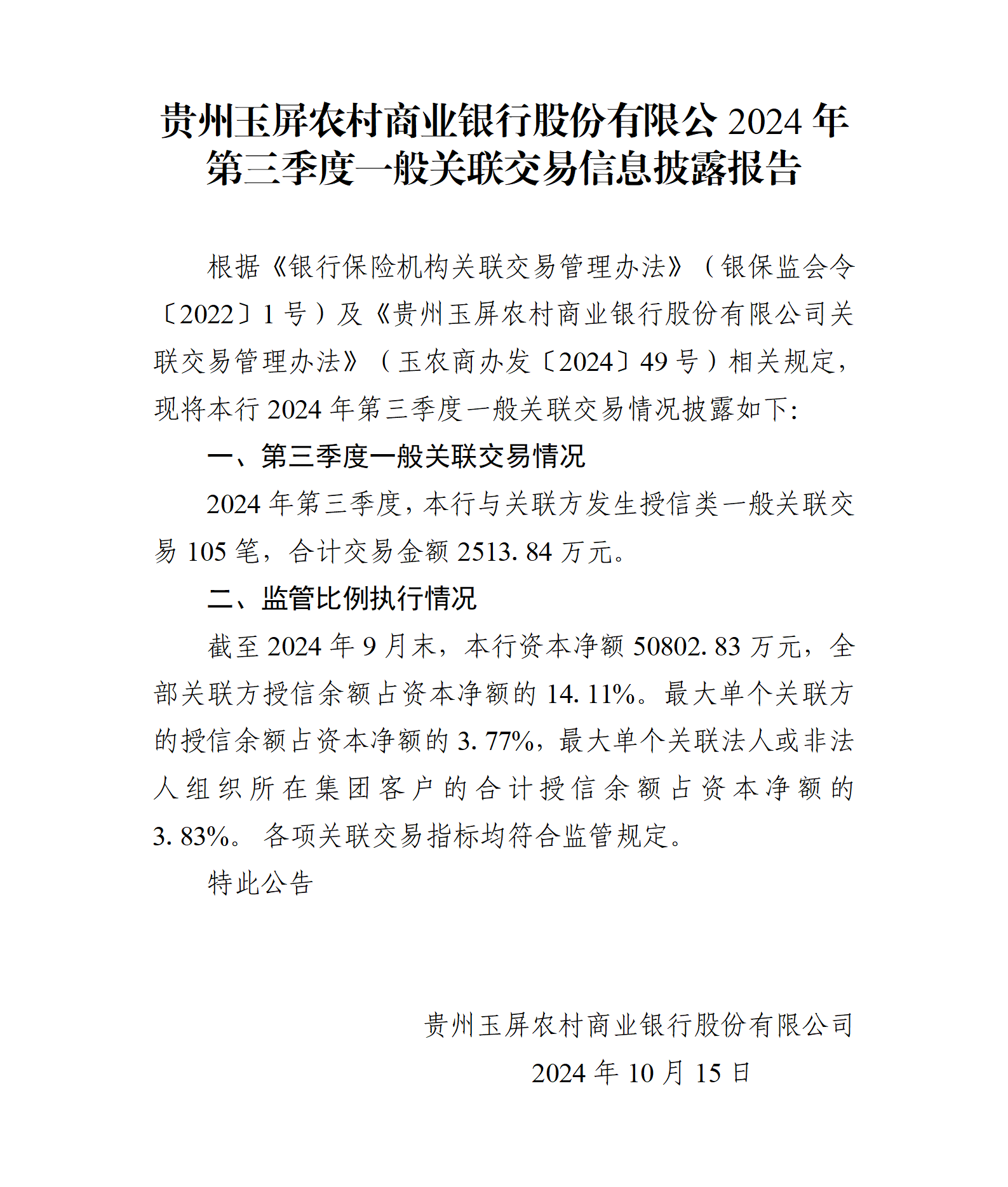 贵州玉屏农村商业银行股份有限公司2024年第三季度一般关联交易信息披露报告