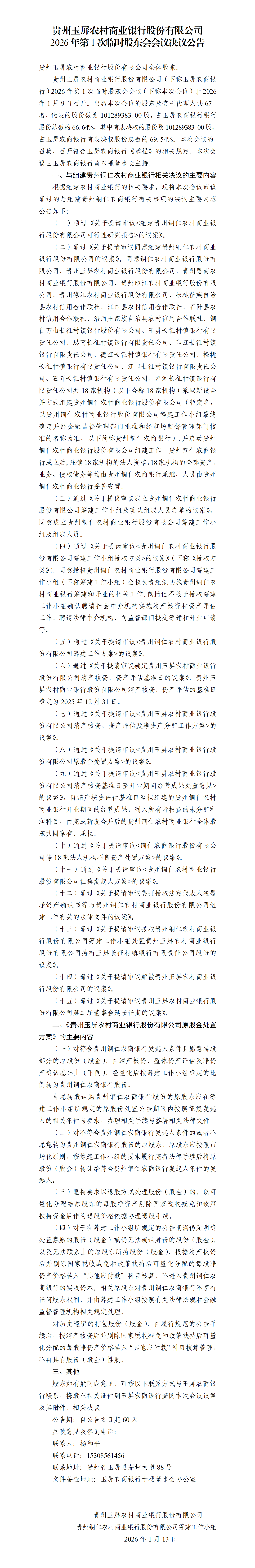 贵州玉屏农村商业银行股份有限公司2026年第1次临时股东会会议决议公告