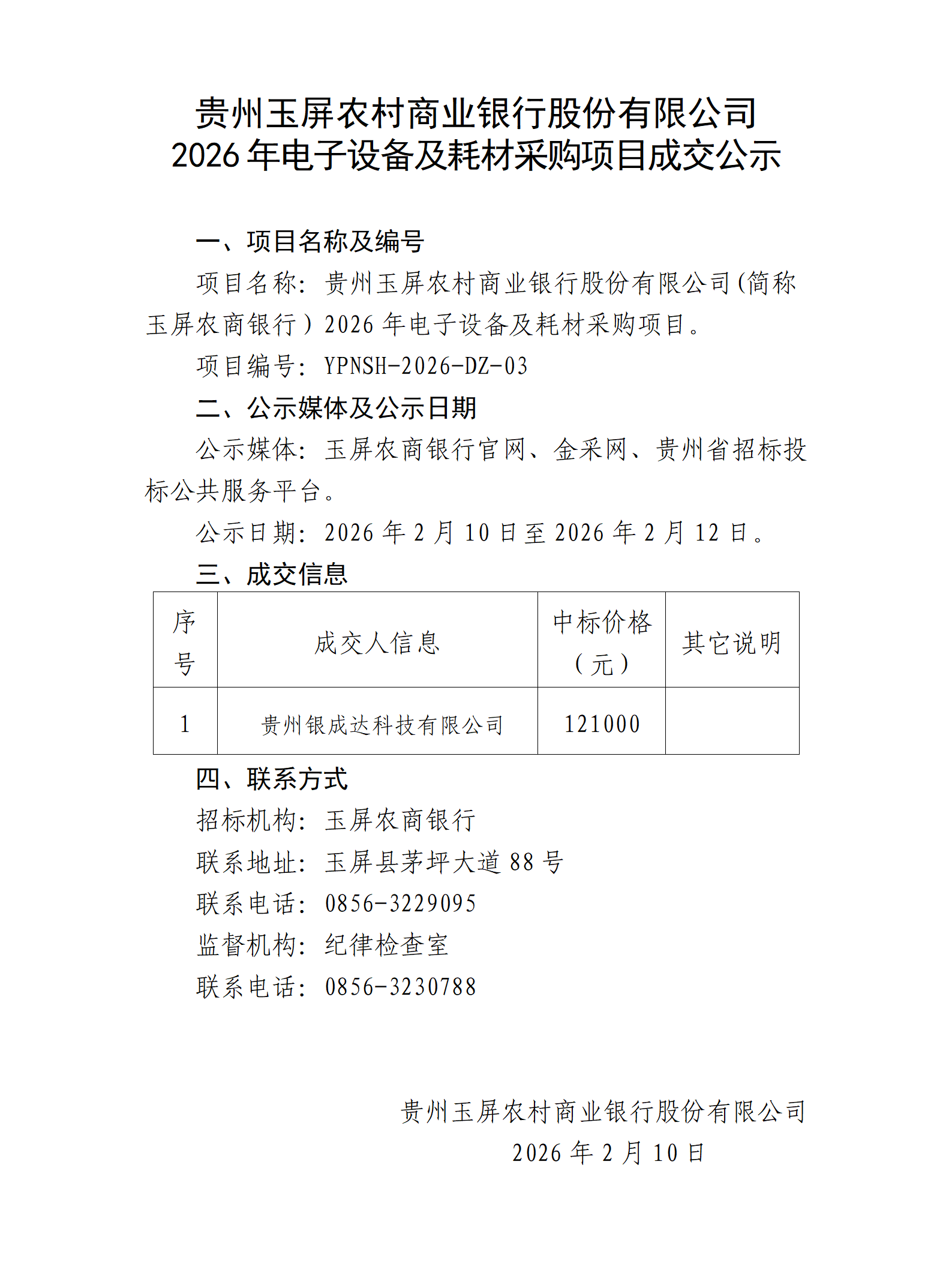 贵州玉屏农村商业银行股份有限公司2026年电子设备及耗材采购项目成交公示