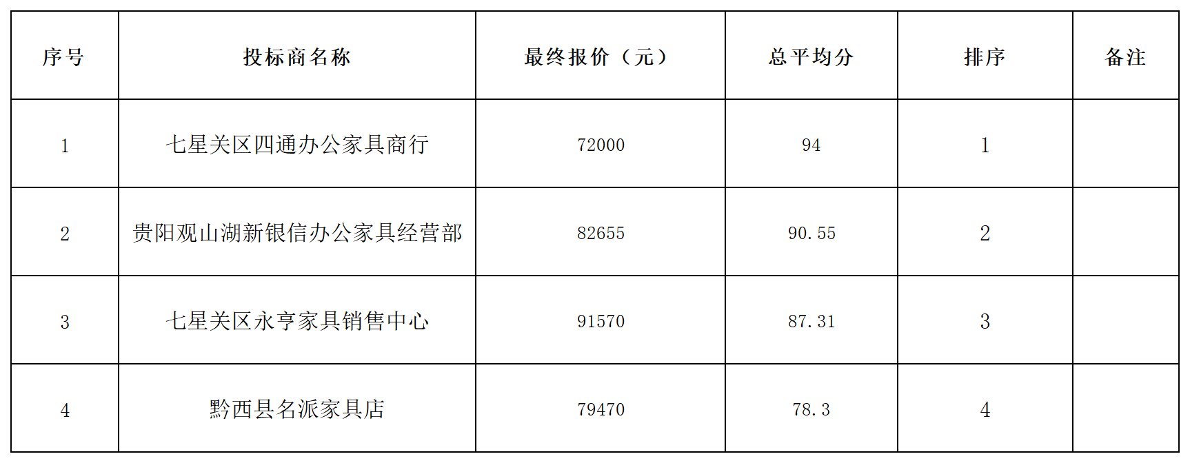贵州黔西农村商业银行股份有限公司办公家具采购项目(项目编号QXNS20250802),根据前期征集情况,共邀请八家供应商参加,共收到四家供应商响应文件,本着公开、公正、公平、诚实信用原则,现就本次采购评审结果公示如下: