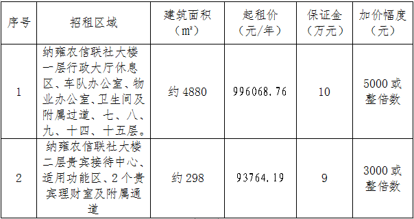 纳雍农信联社将于2025年12月18日10时起至2025年12月19日10时止(延时除外)在淘宝网资产竞价网络平台上(网址http://zc-paimai.taobao.com,户名:纳雍县农村信用合作联社)对综合业务大楼部分办公用房公开招租,现公告如下: