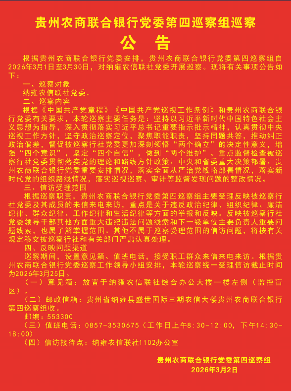 贵州农商联合银行党委第四巡察组巡察公告