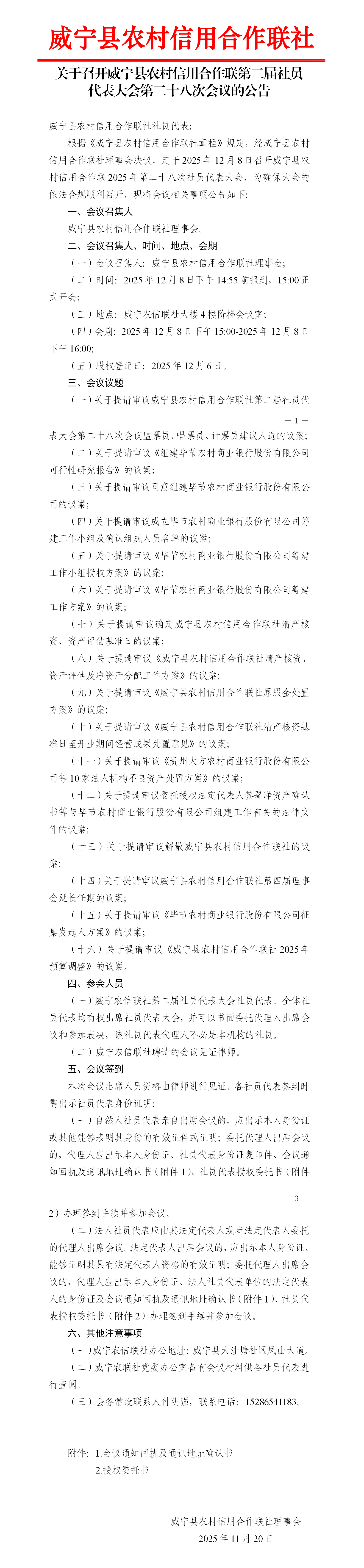 关于召开威宁县农村信用合作联社第二届社员代表大会第二十八次会议的公告