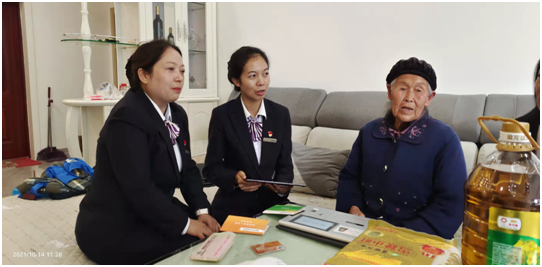 在陈克珍老人家里,客户经理仔细询问老人的身体状况,得知老人的银行卡遗失,高龄补贴迟迟无法支取,及时为老人办理了银行卡,解决老人实际问题。老人高兴的说:“现在国家的政策好,家里都能办业务了”。