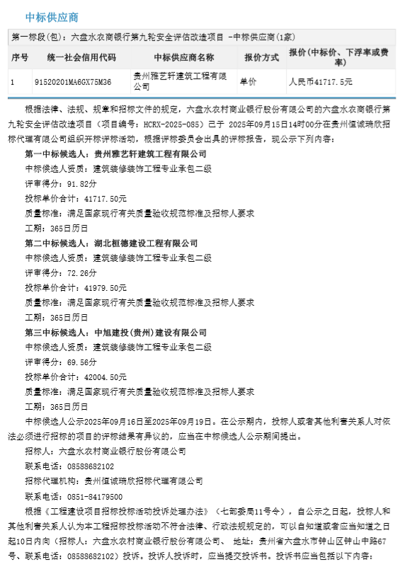 六盘水农商银行第九轮安全评估改造项目中标候选人公示
