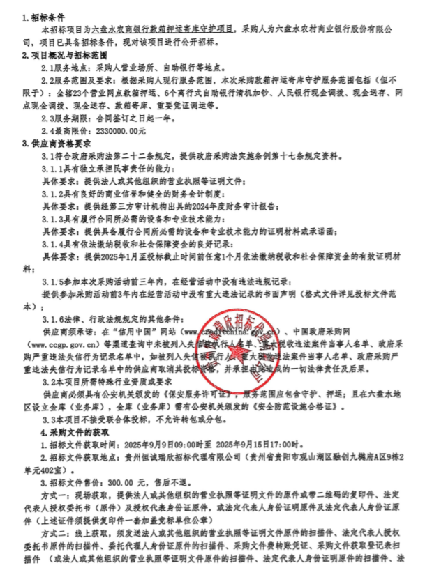 六盘水农商银行款箱押运寄库守护项目招标公告