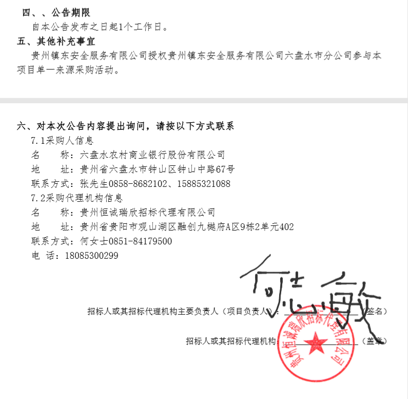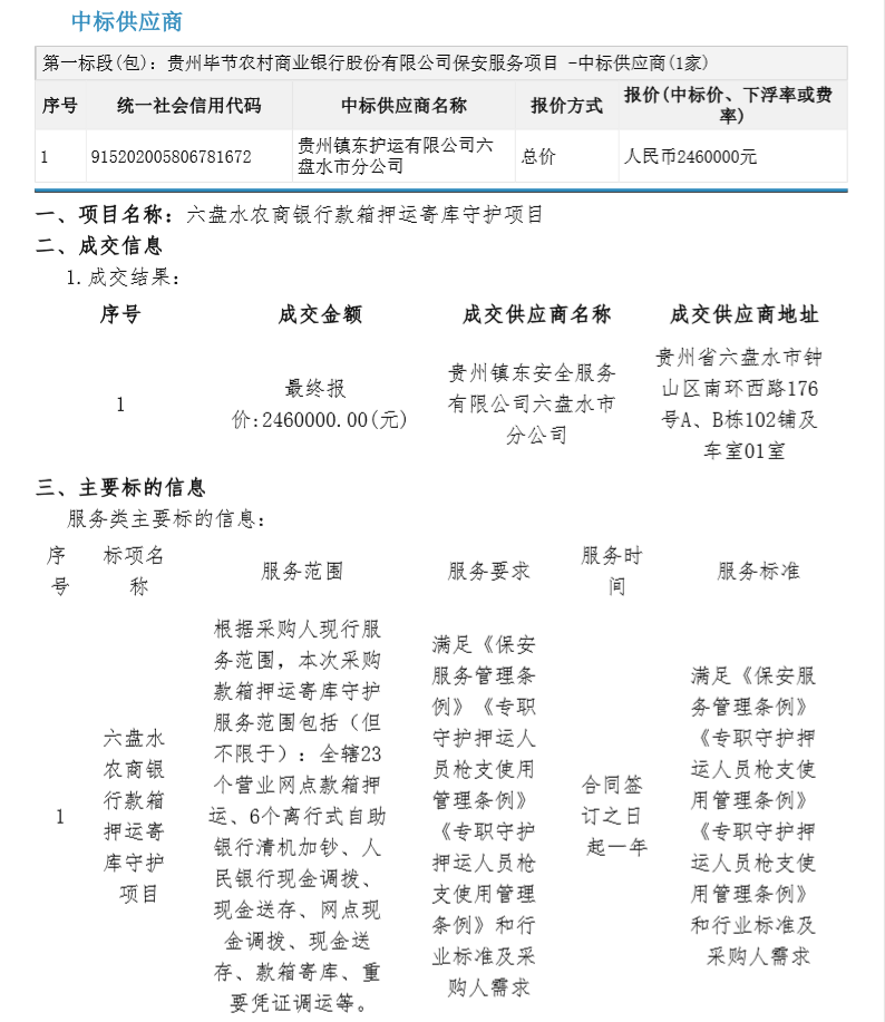 六盘水农商银行款箱押运寄库守护项目单一来源的成交结果公告