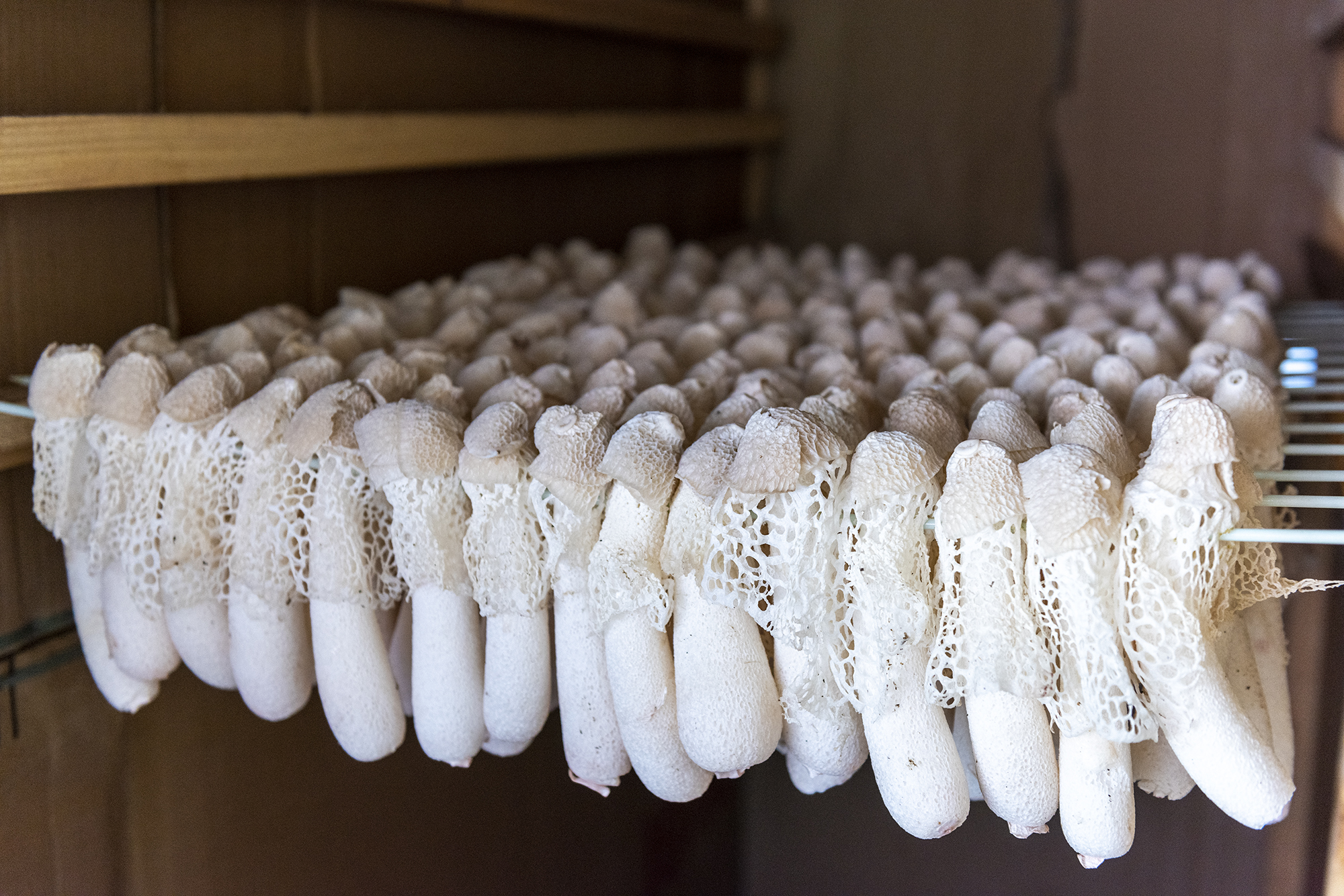 欧阳海的姐姐欧阳淑走进大棚,采了几朵刚撑开“裙摆”的“白雪公主”,一股清香扑鼻而来。“竹荪采回后,先将帽子摘下来洗净,用竹签穿成窜烘干单独买,220元一斤。其他部份烘干后300多一斤,收益还是不错。”