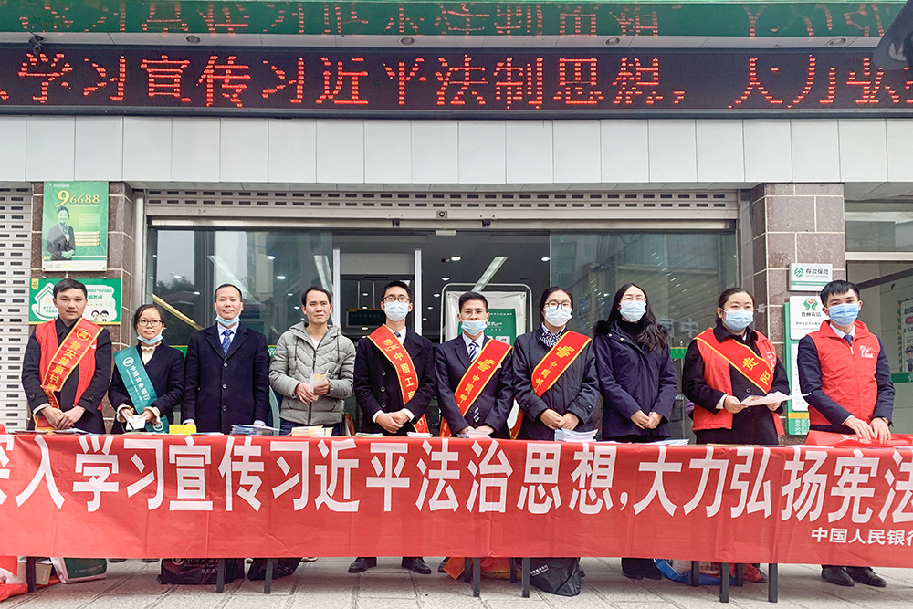 为深入贯彻习近平总书记全面依法治国新思想,提高群众法治意识,弘扬宪法精神。在12月4日国家宪法日来临之际,由人民银行普安县支行牵头,普安农商银行、县工行等七家金融机构共同开展了“深入学习习近平法制思想,大力弘扬宪法精神”的主题活动。