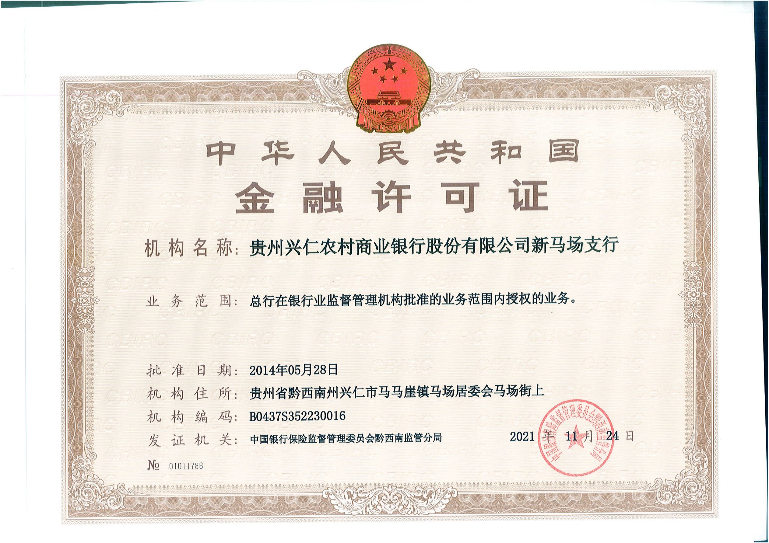 贵州兴仁农村商业银行股份有限公司新马场支行金融许可证公示