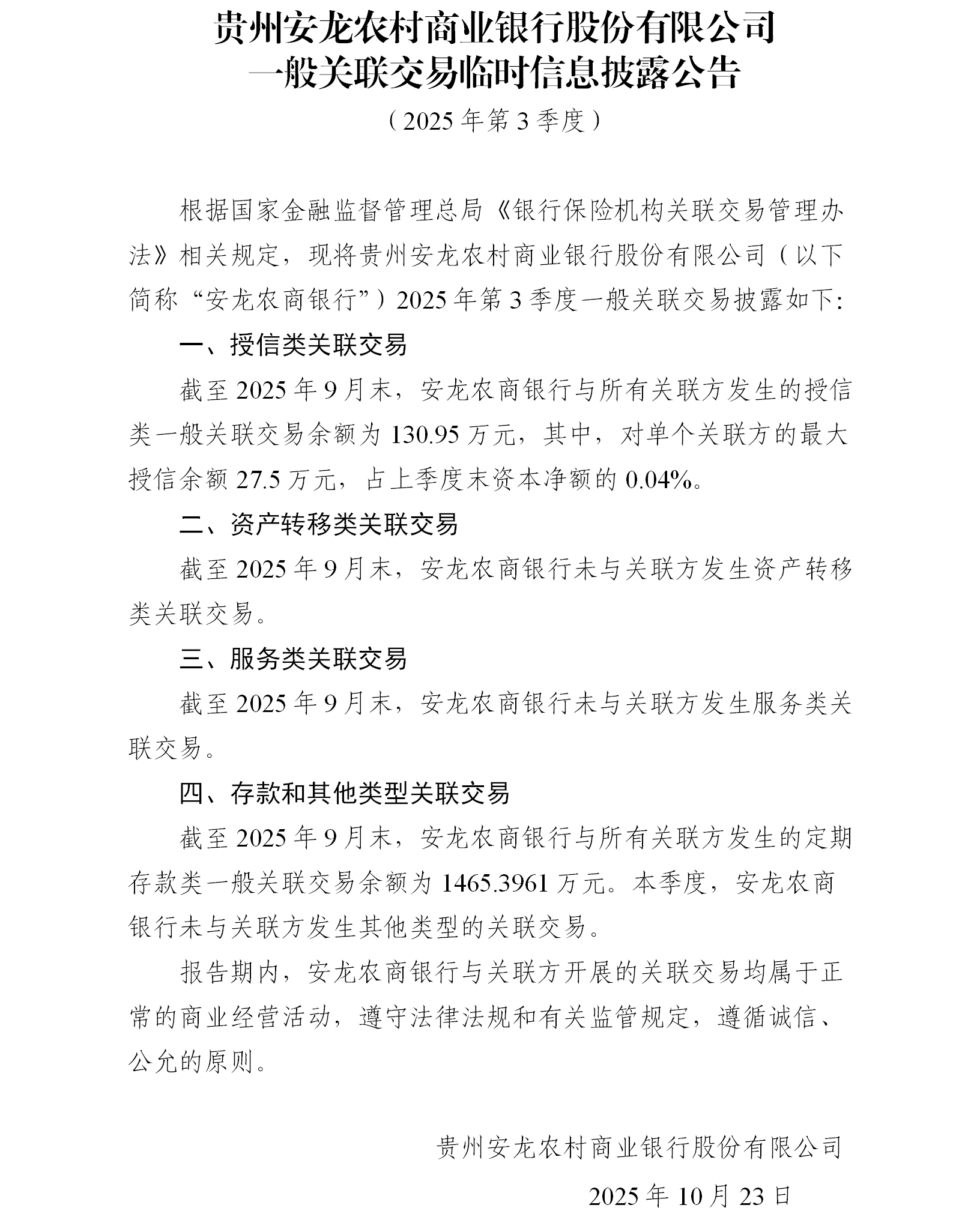 贵州安龙农村商业银行股份有限公司2025年第三季度一般关联交易临时信息披露公告