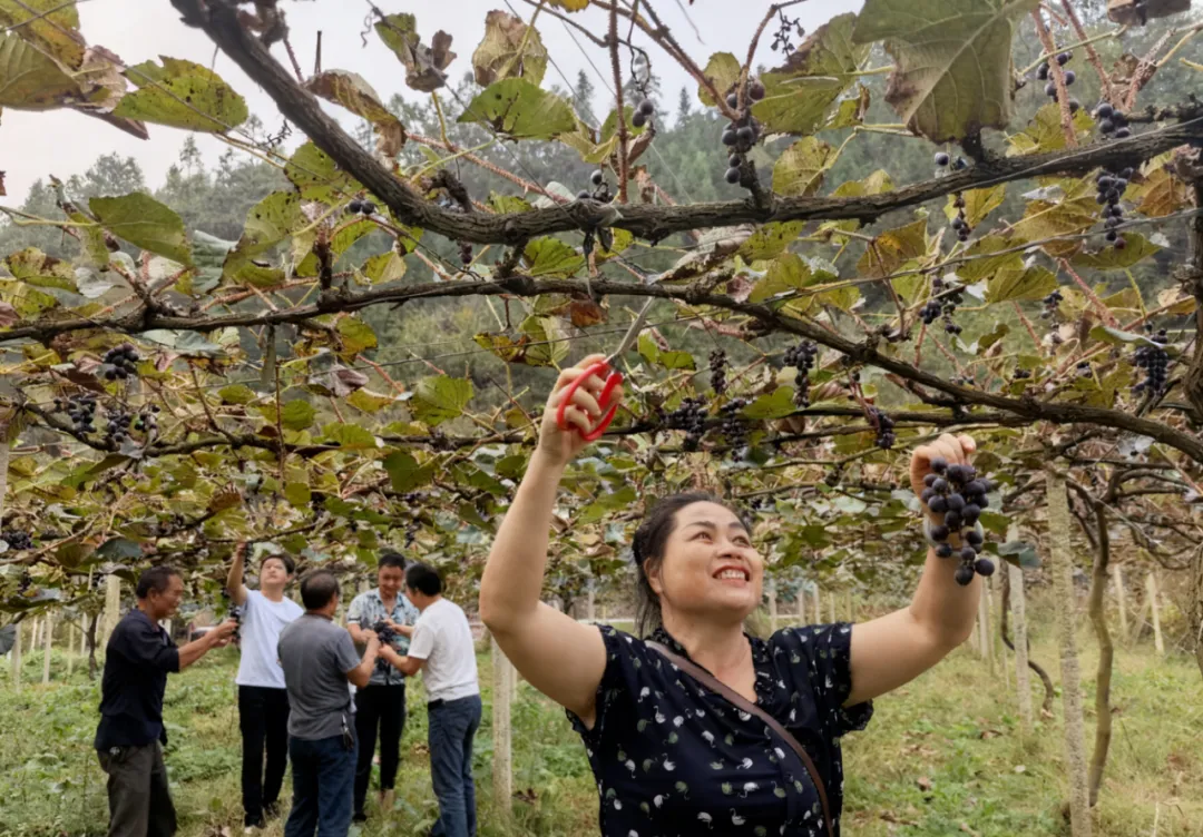 秋高气爽,正是采摘好时节!每到周末,杨某的果园里都会迎来大批亲自采摘的顾客,一串串乌黑发亮的葡萄让人垂涎欲滴。大家亲手摘下沉甸甸的果实,感受果肉在齿间爆汁的清甜,还约上三五好友拍照打卡,体验感拉满。顾客开心地说:“自己摘的葡萄就是甜,这种亲近自然的活动,很有趣!”