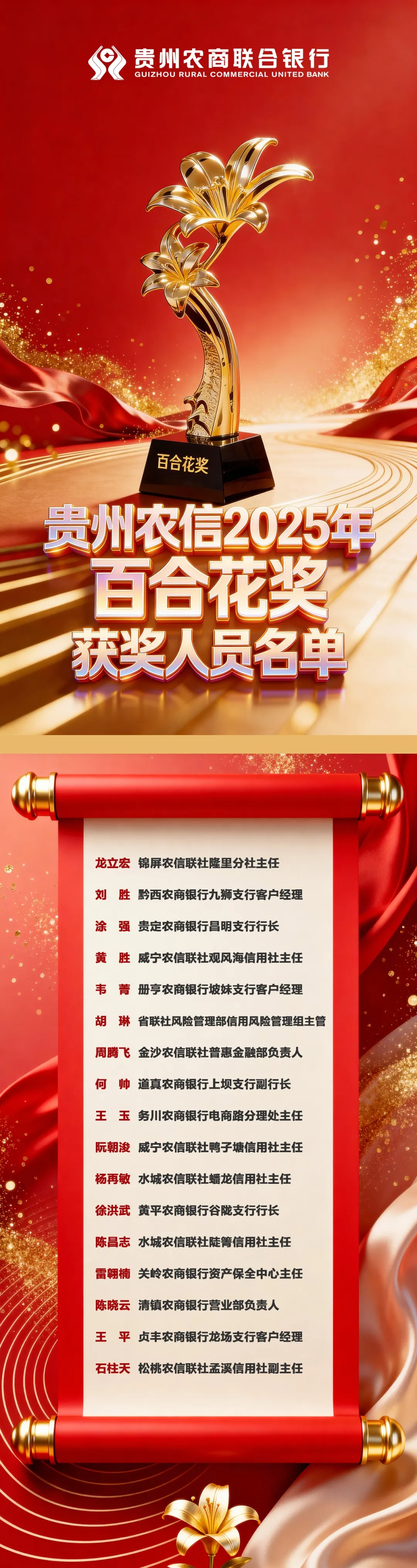 为深入学习贯彻习近平新时代中国特色社会主义思想,弘扬中国特色金融文化与贵州农信企业文化,充分发挥先进典型示范引领作用,省联社开展2025年“百合花奖”评选活动。经民主推荐、资格审核等多轮严格程序,一批在改革发展、普惠服务、社会责任等领域表现突出的先进典型脱颖而出。今日,贵州农商联合银行党委正式授予龙立宏等17名同志“百合花奖”荣誉称号!他们以忠诚铸魂、以实干立身,用初心诠释农信担当,用奉献书写奋斗篇章。让我们一同走近榜样,汲取奋进力量,共同凝聚推动贵州农信高质量发展、服务中国式现代化贵州实践的强大合力!